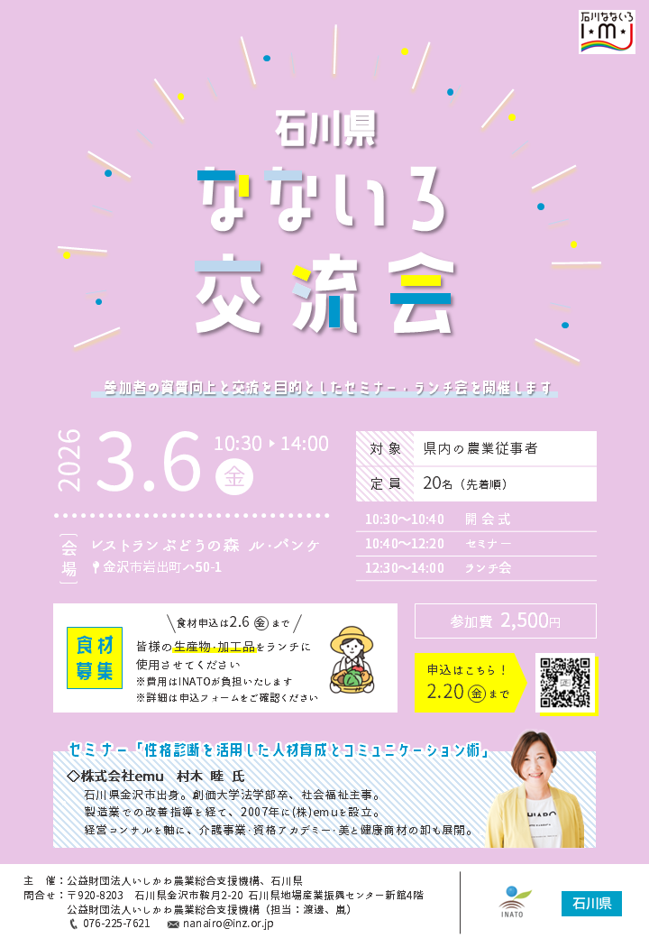 石川県内の農業に従事する方を対象に、情報交換やネットワークづくり、講師による学びの場を目的とした交流会を開催します!